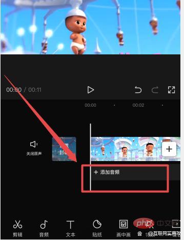 1、剪映软件中导入素材之后,点击“添加音频”。
