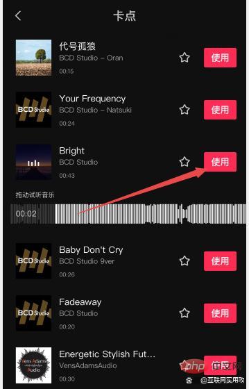 4、点击喜欢的卡点音乐素材之后,点击右侧的“使用”。