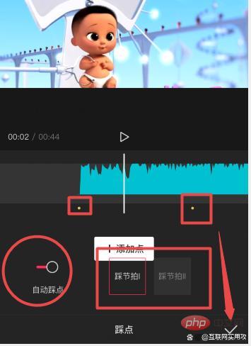 6、开启“自动踩点”,然后可以根据自己的需要,选择“踩节拍I”或“踩节拍II”,选择之后,在卡点音乐素材下方就会出现一些小黄点,这些小黄点就是卡点的位置,点击右下角打钩符号。